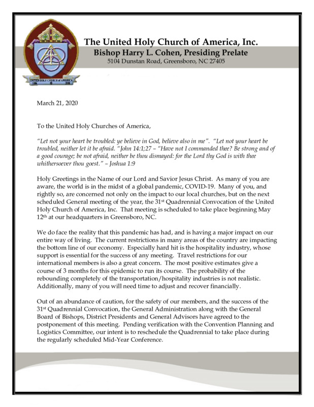 The United Holy Church of America, Inc. Bishop Harry L. Cohen, Presiding Prelate