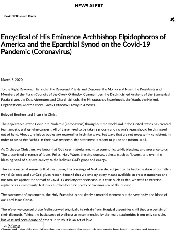 Encyclical of His Eminence Archbishop Elpidophoros of America and the Eparchial Synod on the Covid-19 Pandemic (Coronavirus)