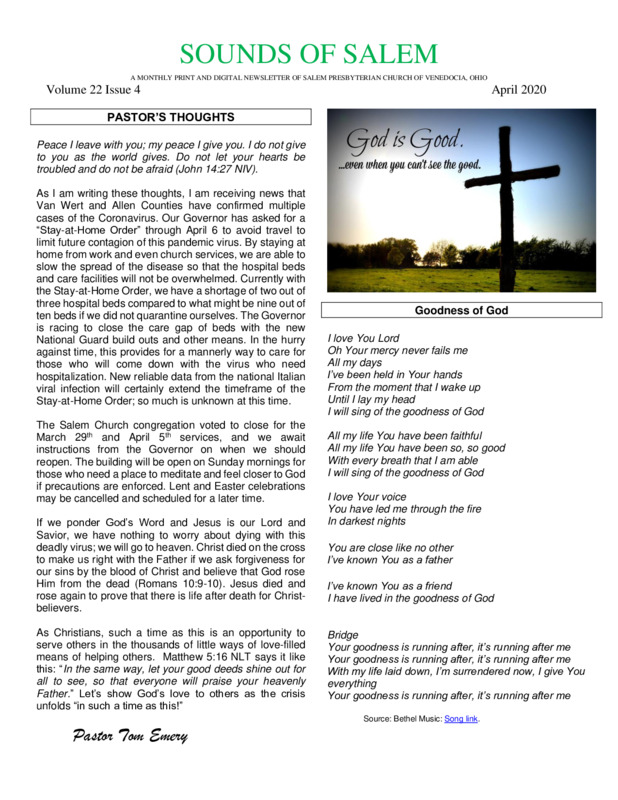 Thomas Emery of The Salem Presbyterian Church demonstrated his support of medical professionals to readers of the April 2020 Newsletter by endorsing both physical health recommendations as well as the use of “spiritual protection”. Thomas Emery states, “By staying at home from work and even church services, we are able to slow the spread of the disease so that the hospital beds and care facilities will not be overwhelmed” (Emery). His use of the word “even” suggests that the church views attending services as more important than work. Despite the evident importance of in-person service, Emery encouraged the Salem Church community to comply with public health guidelines and stay home. He called on his authority as a leader in the church to influence others to comply with social distancing rules. While supporting public health guidelines, Emery advocated for protections from God against serious sickness and death, saying, “— nothing even of my body can be touched by the coronavirus. Though I die, not a hair of my head will perish. Even if my body is touched by COVID-19, it cannot be harmed” (Emery). The church promoted the idea of “spiritual protection” in an attempt to ease the anxiety of the congregation.
